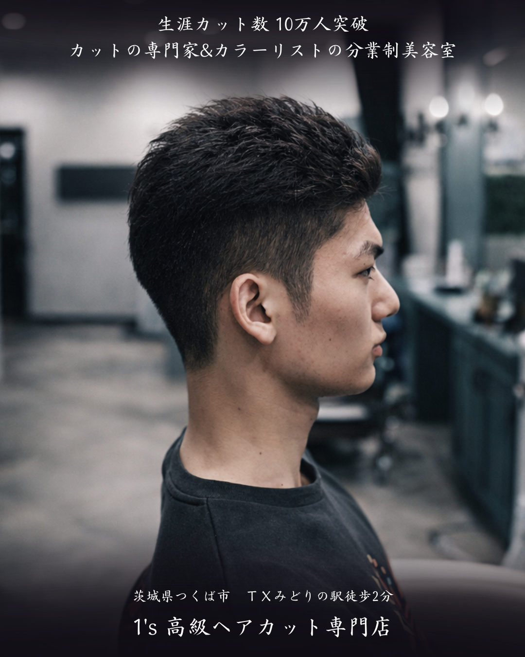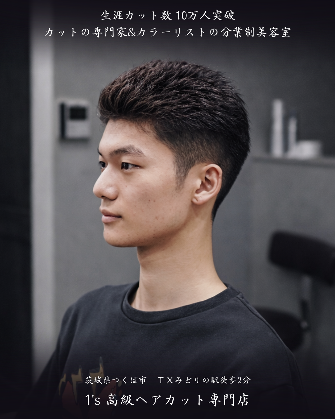 ベリーショートツーブロック Front Side Back 1's 高級ヘアカット専門店 ao. ツンツン立たせられる短さのツーブロック、刈り上げスタイル スタイルデータ 長さベリーショート イメージメンズカット ポイント 髪量 少ない 普通 多い 髪質 柔かい 普通 硬い 太さ 細い 普通 太い クセ なし 少し 強い 顔型 丸型 卵型 四角 逆三角 ベース